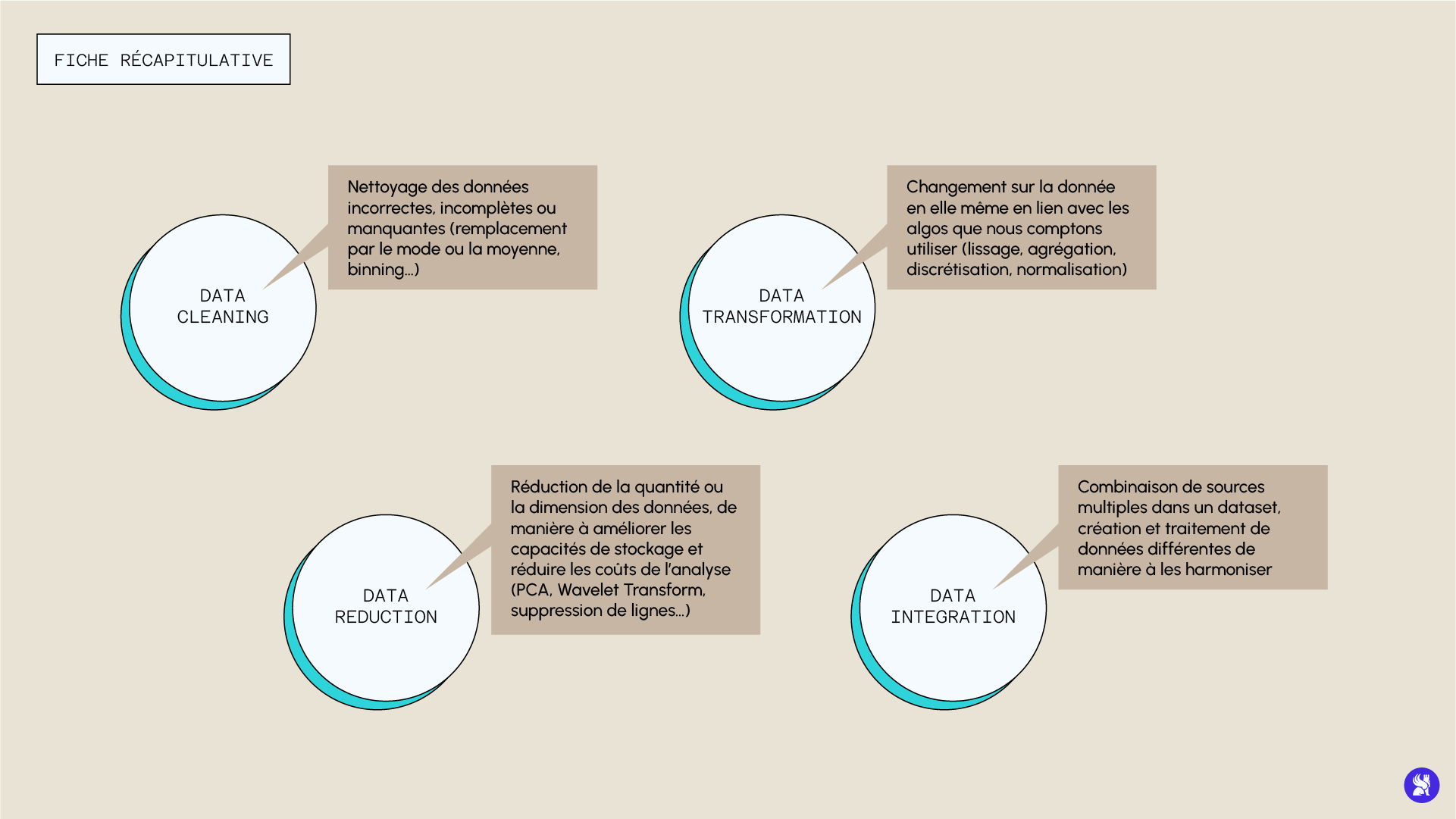L’étape du traitement préliminaire des données est donc l’une des plus importantes dans le traitement et l’analyse de données. Il n’existe pas de méthode parfaite à appliquer à chaque création d’un modèle, mais nous avons vu ensemble les bonnes pratiques à mettre en place dans une stratégie de traitement préalable des données. Les méthodes présentées ici sont explorées plus en profondeur dans nos différentes formations : les concepts mathématiques fondamentaux ainsi que les bonnes pratiques du prétraitement des données en fonction du contexte et de la situation y sont expliquées.