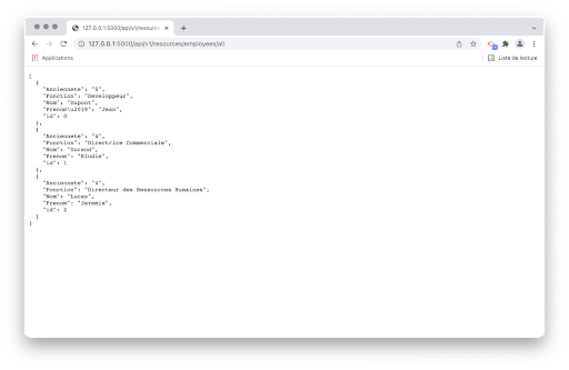 Ainsi, la fonction est exécutée dès lors qu’on accède à http://127.0.0.1:5000/api/v1/resources/employees.