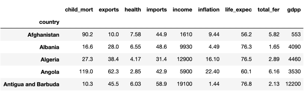 Pour illustrer le principe de l’ACP, nous allons prendre pour exemple un jeu de données nommé ‘country_data’ qui comme son nom l’indique regroupe plusieurs informations (PIB ; Revenu moyen ; Espérance de vie ; Taux de natalité/mortalité etc…) sur différents pays.