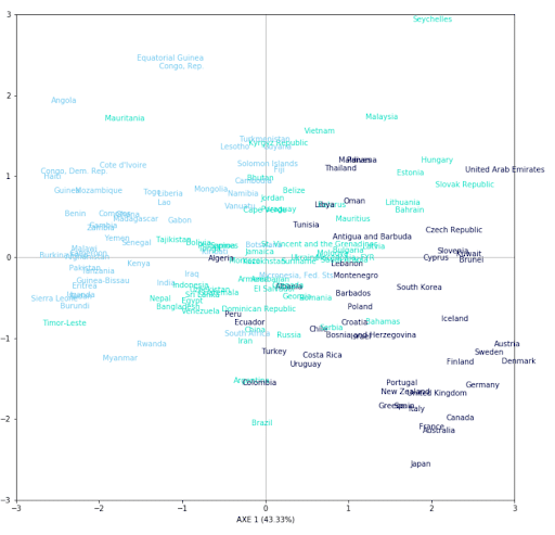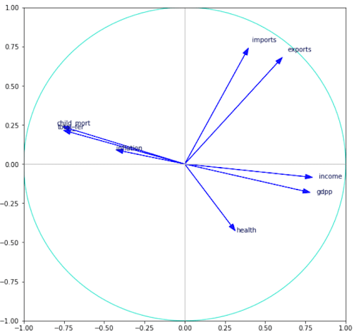 Notre représentation se faisant sur 2 axes, le cercle des corrélations est un outil pratique nous permettant de visualiser l’importance de chaque variable explicative pour chaque axe de représentation. La direction de chaque flèche indique l’axe expliqué par la variable et le sens indique si la corrélation est positive ou négative. On remarque que des variables comme ‘income’,’gdpp’ et ‘health’ sont corrélées positivement au premier axe alors que ‘child_mort’ ou ‘total_fer’ le sont aussi mais négativement. On peut alors s’intéresser à la représentation des pays dans les deux axes choisis par l’ACP et voir l’influence de la variable ‘life_expec’ sur leurs représentations.