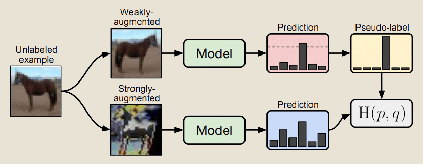 La méthode FixMatch est un autre algorithme utilisé dans cette technique d’apprentissage qui se base également sur la régularisation de consistance pour effectuer des prédictions. En effet, à l’issue de l’apprentissage supervisé, elle réalise des augmentations forte et faible des images non labellisées et l’objectif au cours de l’entraînement de ce modèle c’est que les prédictions des versions augmentées et non augmentées d’une même image soient les mêmes d’où la notion de consistance.