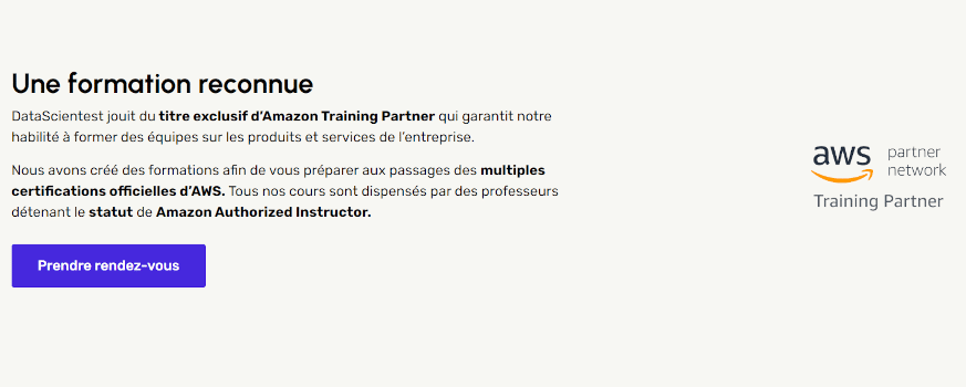 En tant que membre du réseau partenaire d’AWS, DataScientest a le titre d’Amazon Training Partner garantissant son habilité à former des équipes sur les produits et services de cette plateforme cloud. Tous les professeurs dispensant nos cours détiennent le statut Amazon Authorized Instructor.