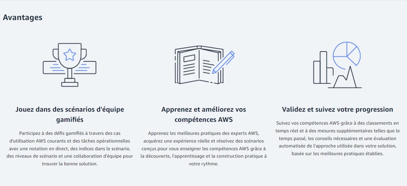À travers ces épreuves, les participants peuvent identifier leurs forces et leurs faiblesses, et les points que lesquels ils peuvent s’améliorer. C’est aussi l’occasion d’apprendre à collaborer sur le cloud au travers de challenges à relever en équipe. Il s’agit donc d’une excellente façon d’apprendre à travailler avec AWS.