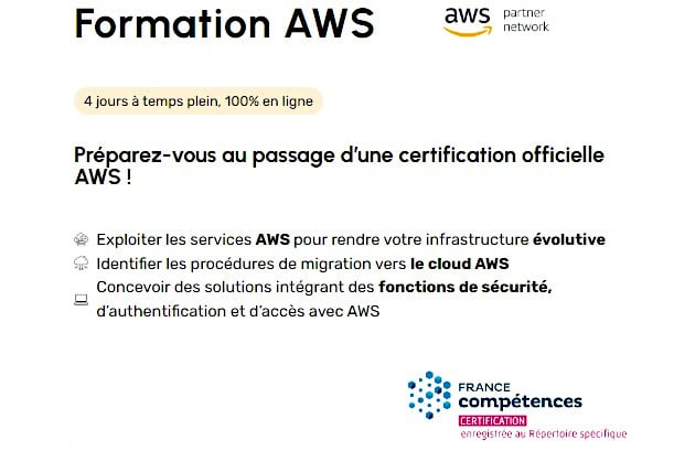 À la fin du parcours, vous serez capable de mettre en place un projet cloud, de développer des applications depuis AWS, de concevoir des architectures résilientes et sécurisées, et d’automatiser les tâches. Ces compétences sont très recherchées en entreprise !