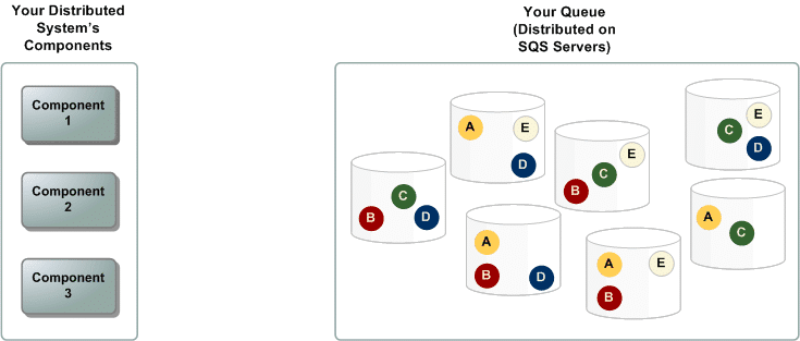 Un système de messagerie distribuée est composé de trois parties principales : les composants du système distribué, la file d’attente (gérée sur les serveurs Amazon SQS), et les messages en attente.