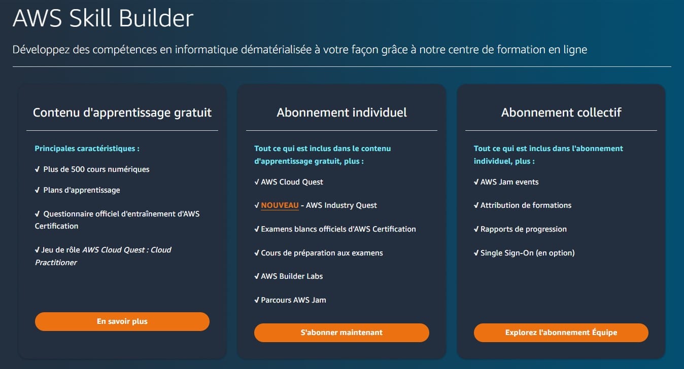 La plateforme AWS Skill Builder permet d’apprendre à utiliser les différents services cloud Amazon Web Services, et d’obtenir une certification pour démontrer cette expertise.