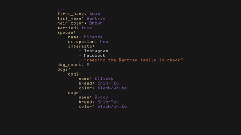 Il n’y a pas de symboles de format habituels tels que les parenthèses ou les guillemets. Les fichiers YAML portent l’extension .yml ou .yaml, et leur structure est une carte ou une liste.