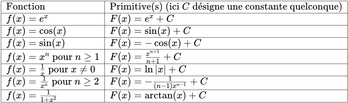 Dans le tableau suivant, on énonce les primitives de quelques fonctions usuelles. On dit alors que F est une primitive de f.