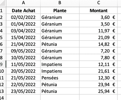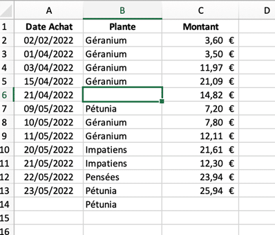 Par exemple, en ayant fait la manipulation ci-dessus, on obtient le tableau suivant: (les données sont donc toutes décalées vers le bas).