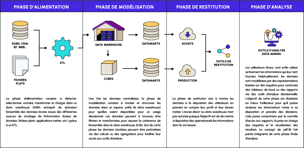 | Alimentation | La première phase du processus décisionnel concerne la collecte de données brutes. Cette phase est rendue possible par l’intermédiaire d’un « ETL » (Extract, Transform, Load) pour faire face à la disparité des formats existants. |