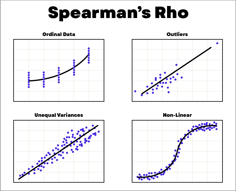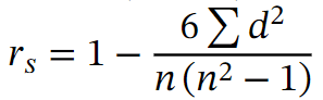 La corrélation de Spearman est une mesure de corrélation qui mesure une relation de monotonie entre deux variables à partir du rang des données. Un exemple de détermination du rang des données est : [58,70,40] devient [2,1,3]. On utilise souvent la corrélation de Spearman pour des données constituées d’outliers. Afin de mesurer la corrélation de Spearman, l’indicateur utilisé est le coefficient de Spearman rs aussi appelé coefficient de rang indiquée par la formule ci-dessous. Dans cette formule, la variable n indique le nombre de points de la série de données. La variable d correspond au carré de la différence des rangs entre chaque point de coordonnées (x,y).