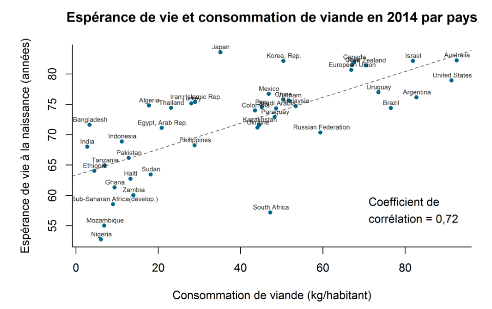 Un exemple d’application de la corrélation de Pearson serait par exemple l’étude de la relation entre la consommation de viande et l’espérance de vie selon le pays.