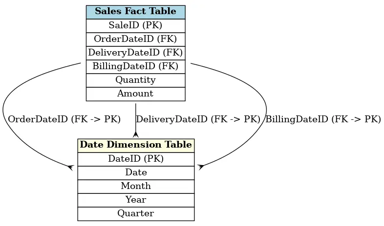 Manche Dimensionen können unterschiedliche Rollen im Datenmodell spielen. Zum Beispiel kann eine Datumsdimension verwendet werden, um das Bestelldatum, das Lieferdatum oder das Rechnungsdatum abzubilden. Man spricht dann von Role-Playing Dimensions. Dies ermöglicht es, Datenverdopplungen zu vermeiden, indem eine einzige Dimension für unterschiedliche Zwecke genutzt wird.