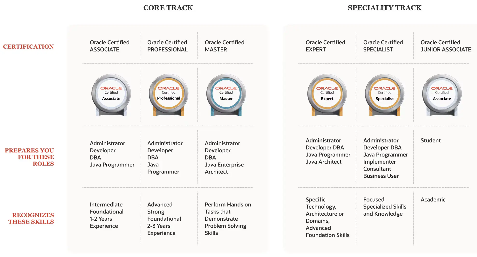 Um den Kandidaten zu ermöglichen, ihre Fähigkeiten schrittweise zu erwerben und diese im Laufe ihrer Karriere nachzuweisen, hat Oracle verschiedene Stufen seiner Zertifizierungen eingeführt. Die Einstiegsebene, der Oracle Certified Associate (OCA), richtet sich an Anfänger. Sie hilft dabei, grundlegendes Verständnis der Oracle-Produkte und -Technologien zu erlangen.