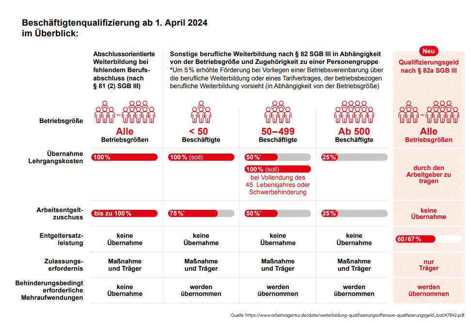 Die Agentur für Arbeit beteiligt sich nicht nur an den Weiterbildungskosten, sondern zahlt zusätzlich Entgeltzuschüsse für Mitarbeitende in Qualifizierungsphasen.
