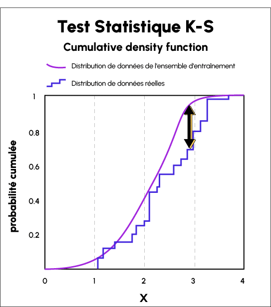 La statistique Kolmogorov-Smirnov est utilisée pour quantifier la distance entre les fonctions de distribution de données du monde réel d’échantillons, et les distributions de données de l’ensemble d’entraînement.