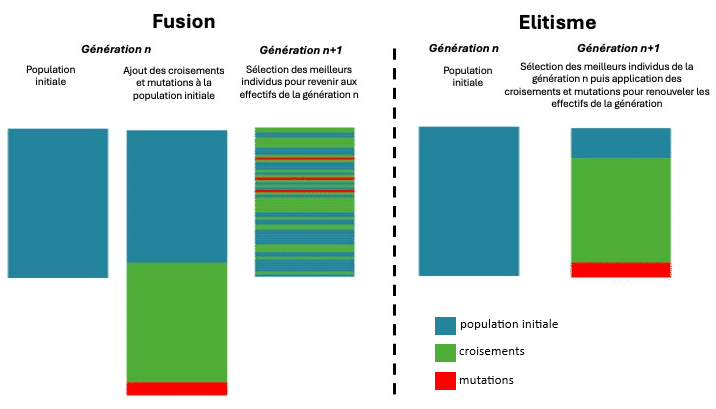 At this stage, two strategies are available: Elitism or fusion. In both scenarios, the aim is to develop a new generation that matches the previous generation in terms of the number of individuals.