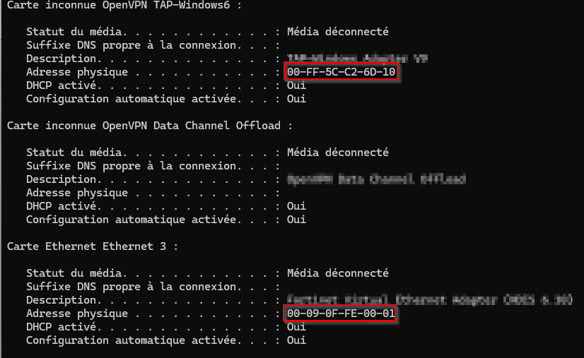 In a command prompt window cmd, enter ipconfig /all. This action will display an outcome akin to the following: