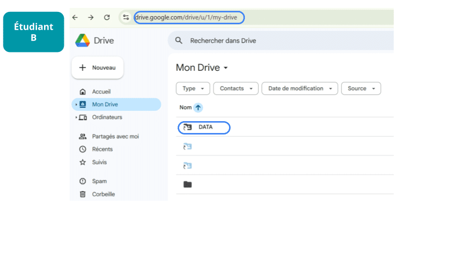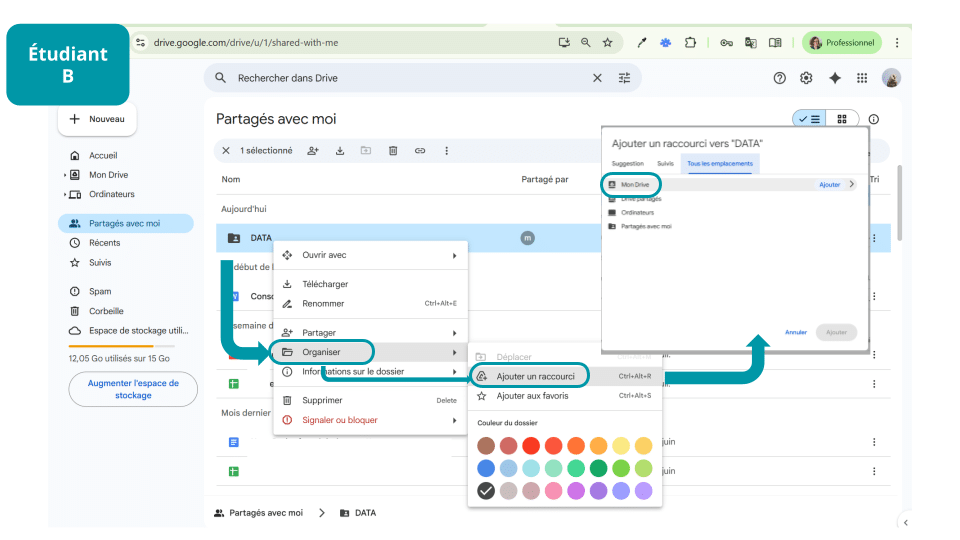 B and C, in turn, will find “Data” among their shared folders, create a shortcut to “Data” (by right-clicking), and place it at the root of their Drives (each in “My Drive”).