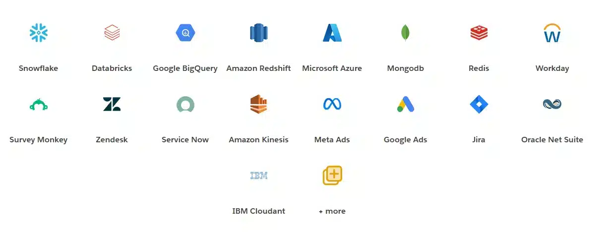 Thanks to the various connectors available, Salesforce is highly adaptable regarding accepted data sources. Snowflake, DataBricks, Microsoft Azure, Google Cloud, Amazon S3… the platform excels in its ability to forge connections with existing digital ecosystems. This allows you to consolidate your informational resource without technical friction.