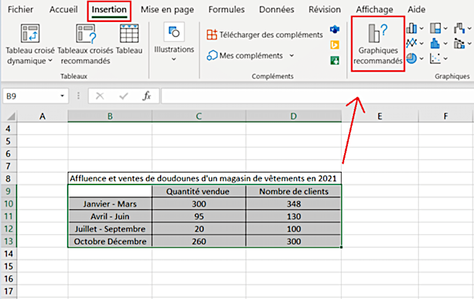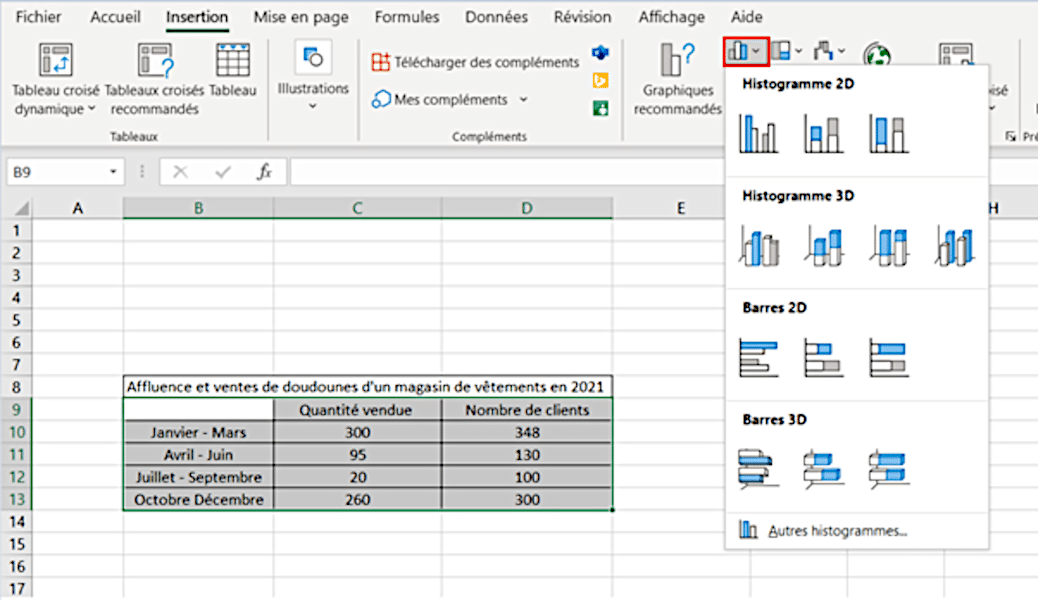 5. Select your data, then click on the Insert tab to select the chart of your choice. It’s important to select the right data, headers and labels to ensure that your chart is complete and, above all, legible.