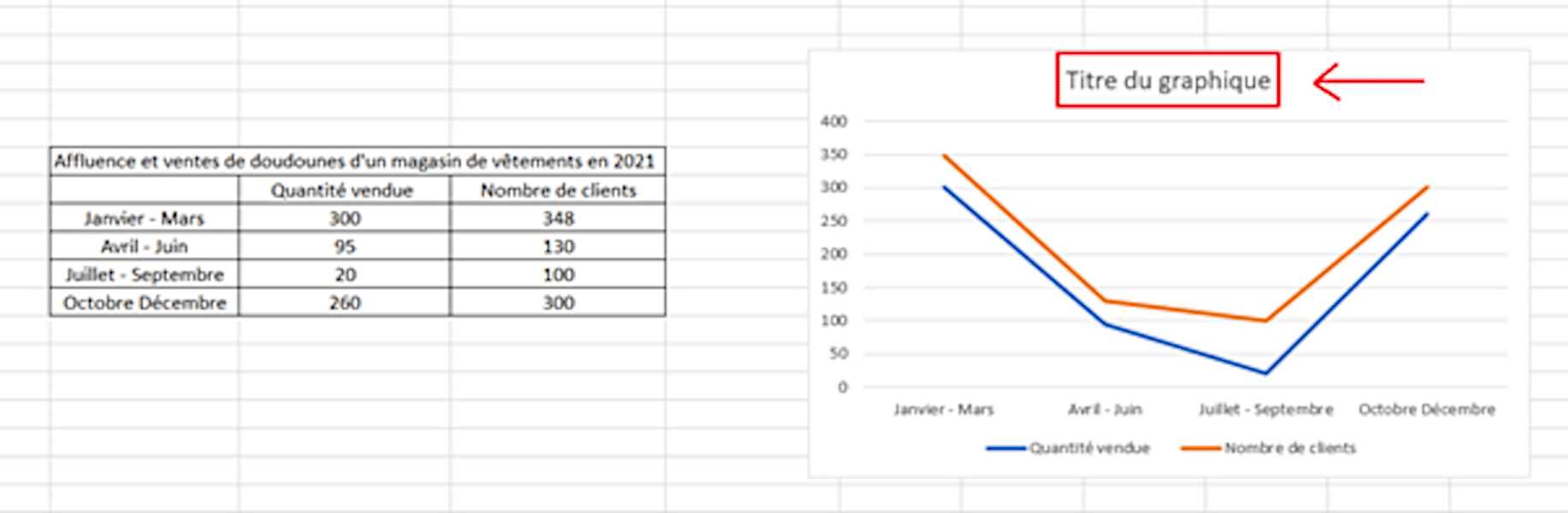 In this example, the aim is to analyze the evolution of sales as a function of time, taking into account the store’s affluence and the time of year. A line graph makes it easy to identify correlations between variables. For example, we can see that the sale of down jackets is highly dependent on the number of customers and the season. The variables “Quantity sold” and “Number of customers” are said to be correlated; the curves have the same shape.