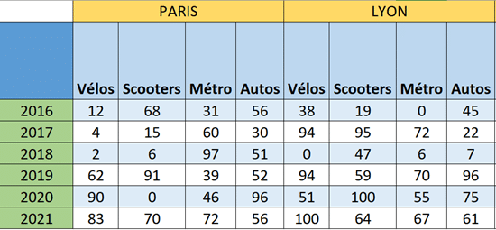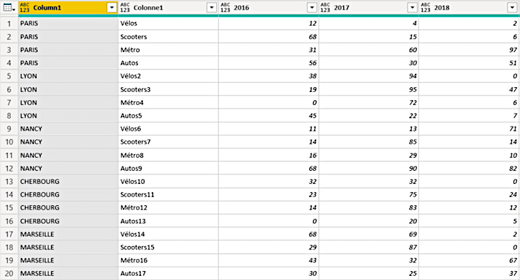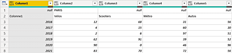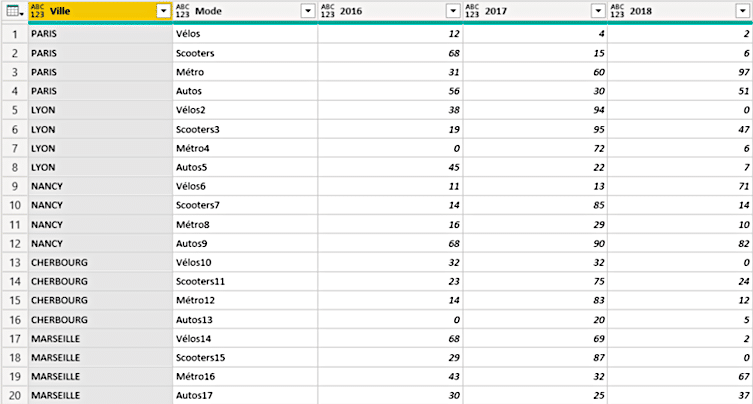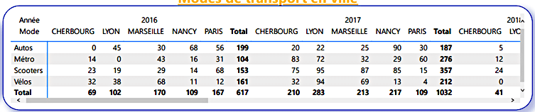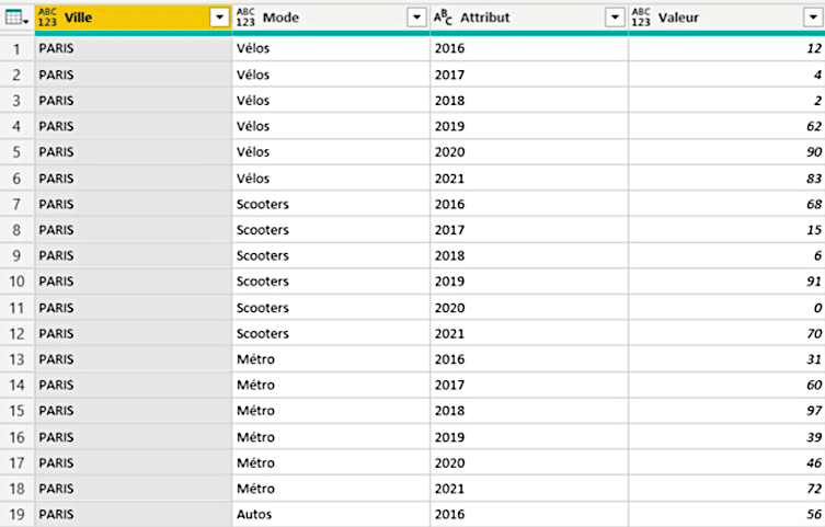 In the example below, we have a table that stores data about modes of transportation in major French cities over time.