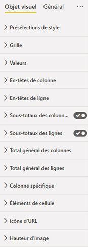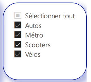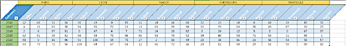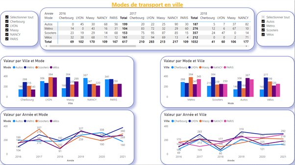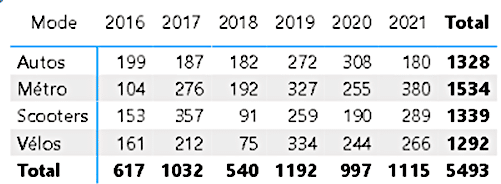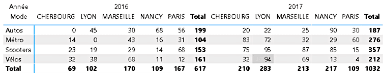 Dans Power BI, le visuel matrice permet de représenter des données en fonction de catégories communes, en lignes et en colonne. Dans notre exemple, les années sont résumées en en-têtes de catégorie de colonnes, déclinées ensuite entre les différentes villes. En ligne, nous retrouvons les différents modes de transport.
