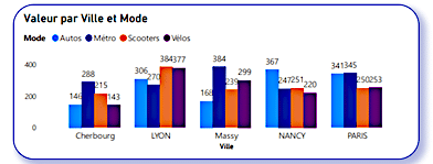 In our example, we represent the total for each mode of transport, classified by city. This visualization enables us to compare different values quickly and visually.