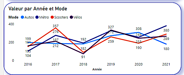 In our example, we show the evolution of the total for each mode of transport (all cities combined) as a function of time. This graph allows us to visualize the temporal evolution of our quantity, and thus to analyze the behavior of the population studied.