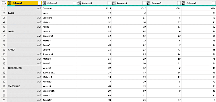 But Power BI cannot utilize data presented in this way. To make this table format usable, several transformations need to be performed using Power Query.