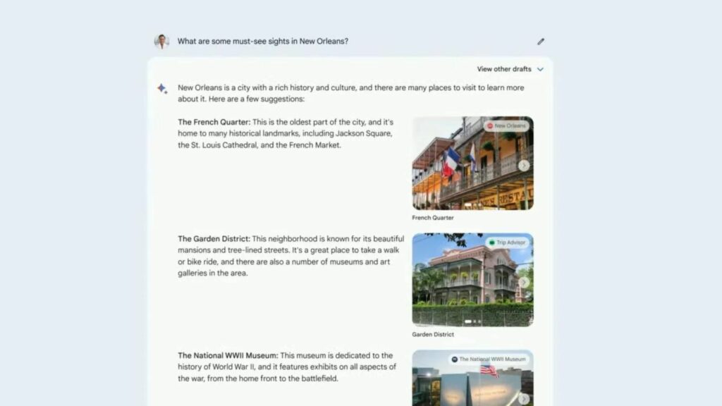 Many features were announced on Bard during the Google I/O. The first one is its multimodal ability to answer and use images. It can answer a question with a picture or add a picture to a text answer. It’s also able to understand that a question refers to an added image.