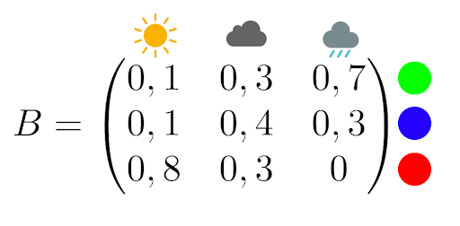 Now let’s suppose that a weather psychopath has locked you in a windowless room with only a computer and a lamp. Every day, the lamp lights up in a certain color according to the weather. Your kidnapper provides you with the following observation matrix: