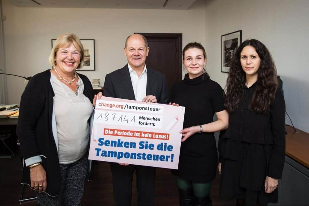 - I supported Nanna and Yasemin in demolishing the tampon tax in Germany. Period products used to be taxed with 19% – the luxury VAT – nowadays it’s only 7%, like other everyday products.