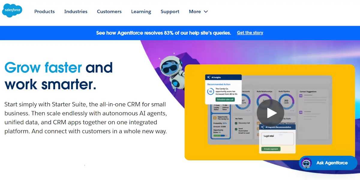 La solución Agentforce introducida en 2024 tiene una vocación mucho más amplia: se trata de una plataforma de agentes IA autónomos, accesible en cualquier momento. Está diseñada para asistir a las fuerzas de ventas, pero también a muchos trabajos auxiliares y también, a los propios clientes mediante chatbots capaces de integrar en sus respuestas un conocimiento profundo de la empresa. En este sentido, marca un hito significativo en las soluciones de Salesforce al integrar la inteligencia artificial generativa. Salesforce inicialmente integró IA en sus herramientas con la plataforma Einstein, introducida en 2016. Sin embargo, la llegada de ChatGPT obligó a la empresa de Marc Benioff a avanzar mucho más.