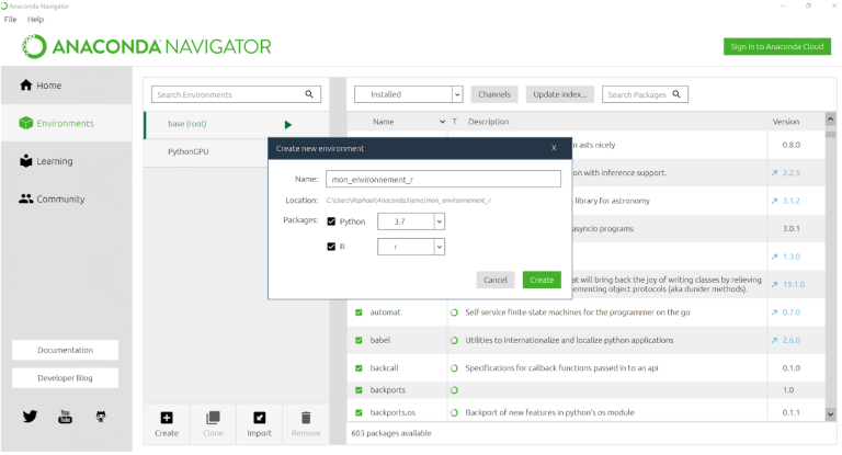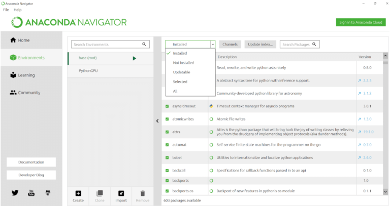 Para esto, nada más sencillo: en la pestaña Environments, basta con crear un nuevo entorno virtual haciendo clic en Create. A continuación, instala o actualiza los paquetes que necesites, gracias al menú de la izquierda.