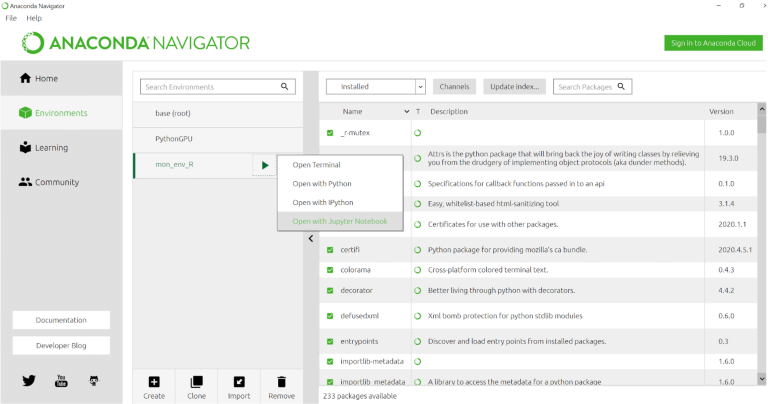 - Abre el entorno con el paquete R haciendo clic en la opción Open with Jupyter Notebook.