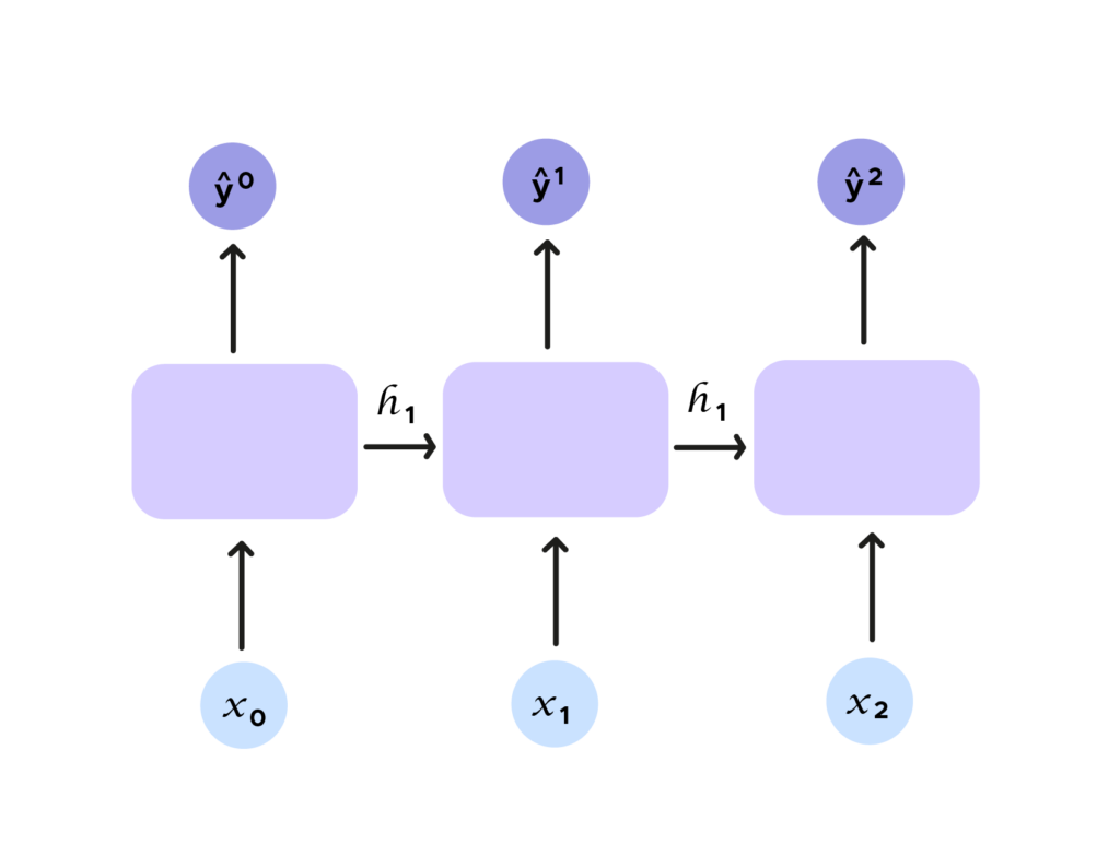 Como hemos indicado antes, estudiamos el movimiento de la pelota de manera local. Queremos tener en cuenta varios instantes del movimiento de la pelota. Si no lo conseguimos con una red neuronal tradicional, con las RNN, todo cambia, porque se introduce el concepto de recurrencia. Efectivamente, observemos la figura de abajo. Añadimos una entrada h_t, llamada estado escondido (hidden state). Ese estado escondido encarna ŷ_t y se da como argumento para la próxima predicción además de la entrada x_t. Efectivamente hemos considerado un conjunto y por tanto, vinculamos las salidas y las entradas sin límite para nuestras muestras de entrada.