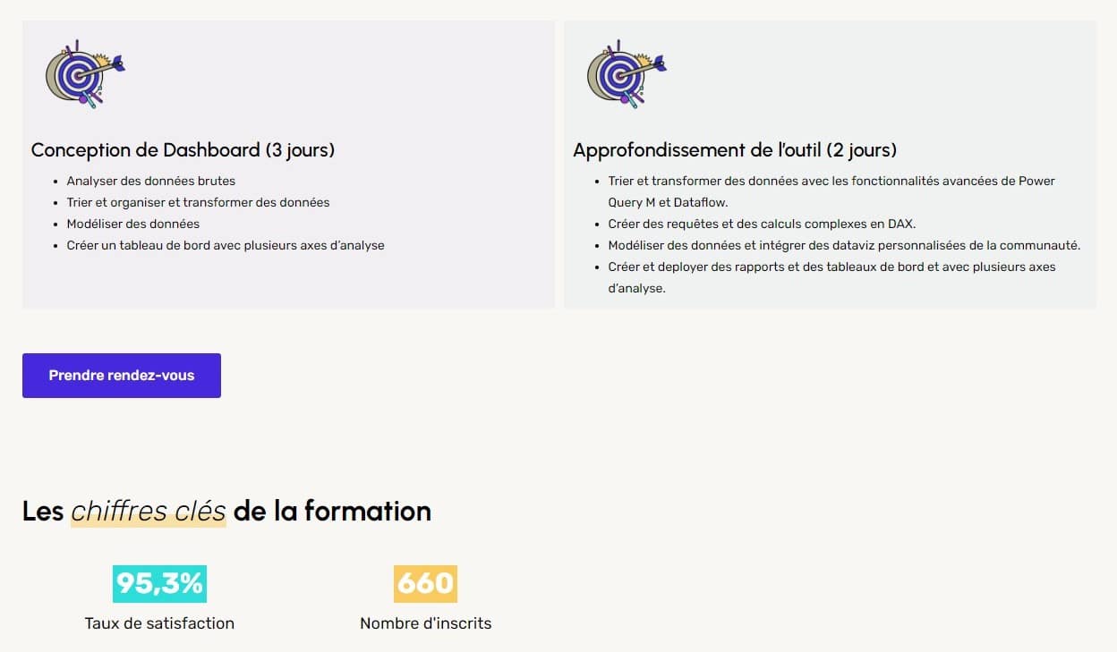 Les différents modules du cursus couvrent les concepts fondamentaux de Power BI comme le langage DAX et le moteur Power Query, mais aussi les notions plus avancées comme le DataFlow.