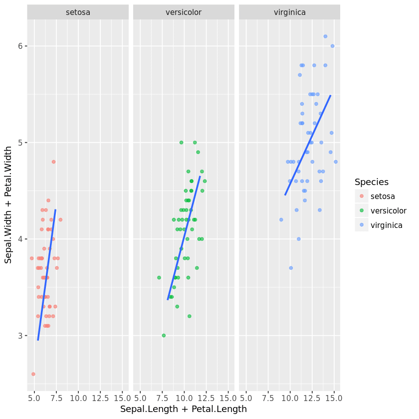 p = ggplot(iris, aes(x=Sepal.Length + Petal.Length, y = Sepal.Width + Petal.Width))