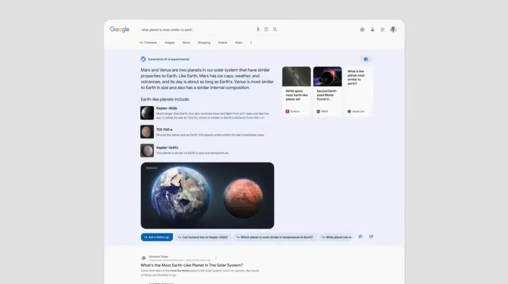 De la même façon qu’OpenAI a amélioré le moteur Bing de Microsoft, Google intègre l’IA dans son moteur de recherche. Pour ce faire, Google utilise son nouveau modèle d’intelligence artificielle, PaLM 2.