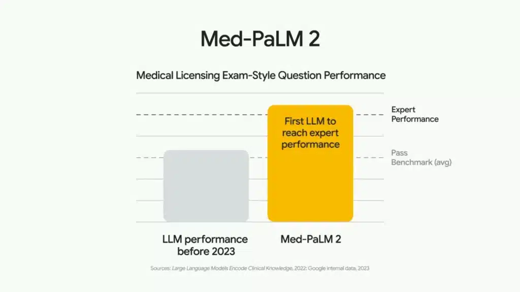 En plus de connaissances générales très poussées, PaLM 2 possède plusieurs variantes. Ces variantes lui apportent des connaissances beaucoup plus spécifiques selon le domaine choisi. Grâce à une variante nommée “fine-tuning” il peut répondre à des questions et des problématiques de cybersécurité comme détecter des menaces ou des scripts malfaisants. Un autre exemple est celui de la médecine avec “Med-PaLM 2” qui lui permet d’interpréter une image de radiologie.