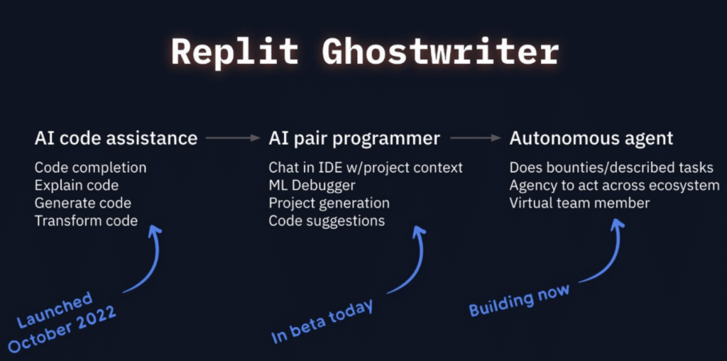 Replit souhaite utiliser les capacités des IA de Google pour améliorer la suggestion des blocs de code, la complétion des programmes et la réponse aux questions des utilisateurs. Replit souhaite se distinguer de Copilot X en fournissant un meilleur système que celui proposé par GitHub. Les différents logiciels de Ghostwriter serviront à accompagner le développeur à chaque étape de création.