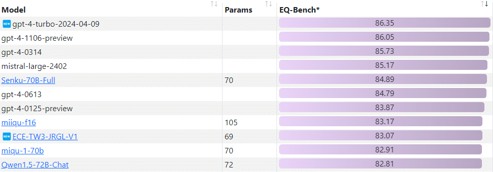 Pour le classement Combined, ECE-TW3-JRGL-V1 se retrouve également entre les modèles miiqu-f16 et Senku-70B-Full à deux places de LLaMa 3 70B Instruct, le LLM open source de Meta.