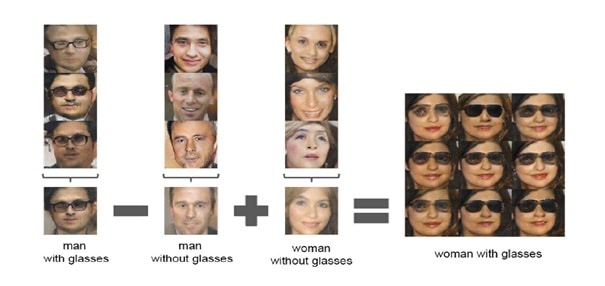 Cette arithmétique est une des caractéristiques de l’espace latent et l’on a des résultats encore plus intéressants. Comme on peut associer les vecteurs de l’espace latent à leur sortie du décodeur, cette arithmétique se transmet à la sortie ! Par exemple, en additionnant un vecteur correspondant à un homme avec lunettes dans l’espace avec un correspondant à une femme sans lunettes et en soustrayant le vecteur correspondant à un homme sans lunettes, on obtient des images de femmes avec lunettes.