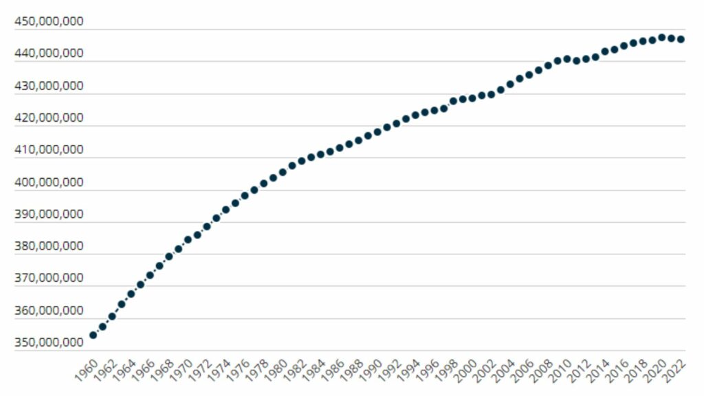 Grâce aux analyses prédictives des Data Analyst d’Eurostat, la population de l’Union Européenne devrait augmenter jusqu’à un pic de 449,3 millions vers 2026, puis décliner progressivement pour atteindre 416,1 millions en 2100. Toutefois, il est prévu que 11 États membres de l’UE voient leur population croître, avec la migration nette comme principal contributeur.
