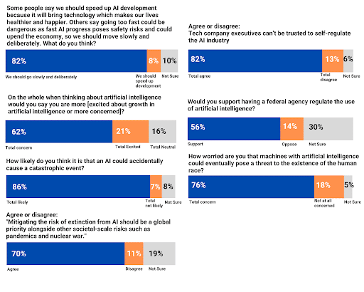 Une majorité d’électeurs ne fait pas confiance aux dirigeants du secteur technologique pour autoréguler leur utilisation de l’intelligence artificielle, 83 % des électeurs pensent que l’IA pourrait accidentellement provoquer un événement catastrophique, 72 % voulant ralentir le développement et l’utilisation de l’IA.