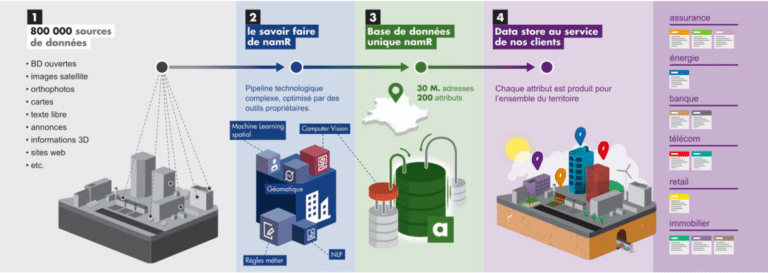 Depuis 2017, namR collecte des données géographiques provenant des sources publiques ou de ses partenaires. Après avoir relié toutes les données à des adresses, un lien est établi entre les adresses et les bâtiments. Enfin, namR est en mesure de fournir plus de 200 caractéristiques à ses clients sur leurs adresses et ainsi leur permettre de mieux cibler leurs consommateurs ou d’intervenir sur leurs locaux pour les entreprises ayant une multitude d’adresses. Tout ce process nécessite une expertise dans la reconnaissance d’images ou computer vision ainsi qu’en compréhension du langage (NLP).