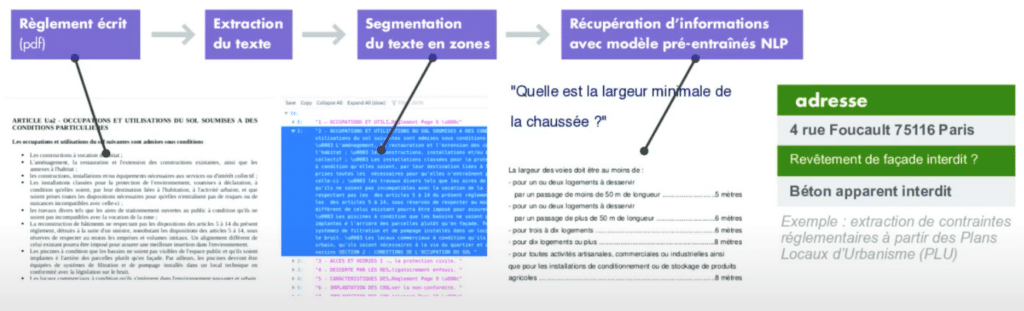 En plus de la computer vision, namR fait appel à des algorithmes de natural language processing (NLP) pour analyser les plans locaux d’urbanisme (PLU) ou des permis de construire pour les lier à des adresses et des bâtiments et ainsi en déduire des données sur des adresses.