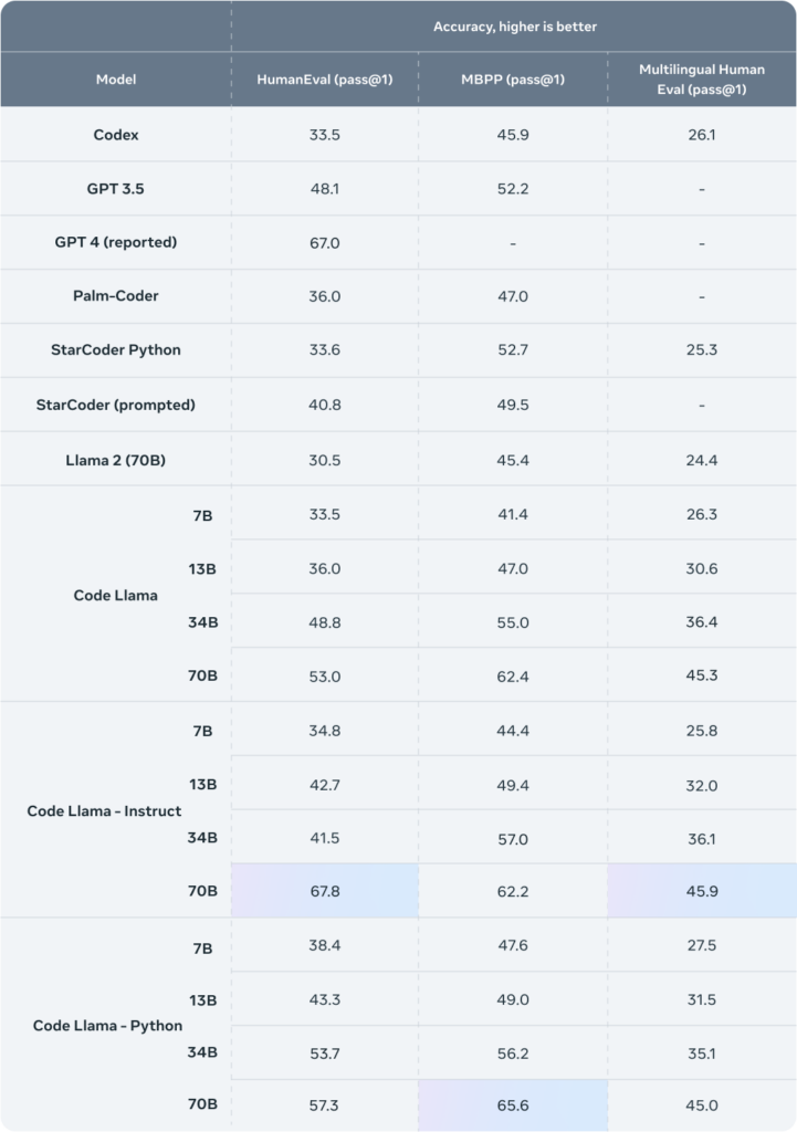 Résultat, Instruct 70B a atteint un score de 67,8 % sur HumanEval contre 67 % pour GPT-4. Python 70B a lui battu le précédent record de 62,4 % par Llama 70B et obtenu 65,6 %. Ces nouveaux records font de Llama le plus puissant LLM open source sur le marché.